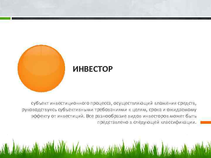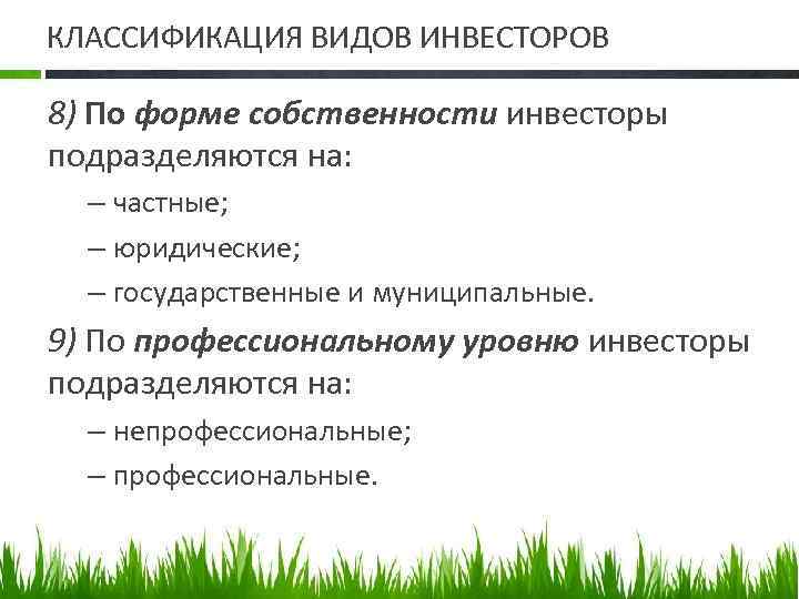 КЛАССИФИКАЦИЯ ВИДОВ ИНВЕСТОРОВ 8) По форме собственности инвесторы подразделяются на: – частные; – юридические; – государственные и муниципальные. 9) По профессиональному уровню инвесторы подразделяются на: – непрофессиональные; – профессиональные.