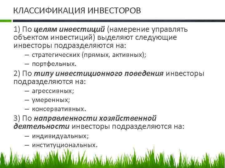 КЛАССИФИКАЦИЯ ИНВЕСТОРОВ 1) По целям инвестиций (намерение управлять объектом инвестиций) выделяют следующие инвесторы подразделяются на: – стратегических (прямых, активных); – портфельных. 2) По типу инвестиционного поведения инвесторы подразделяются на: – агрессивных; – умеренных; – консервативных. 3) По направленности хозяйственной деятельности инвесторы подразделяются на: – индивидуальных; – институциональных.