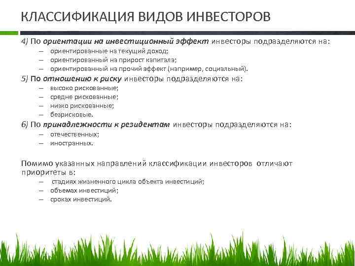 КЛАССИФИКАЦИЯ ВИДОВ ИНВЕСТОРОВ 4) По ориентации на инвестиционный эффект инвесторы подразделяются на: – ориентированные на текущий доход; – ориентированный на прирост капитала; – ориентированный на прочий эффект (например, социальный). 5) По отношению к риску инвесторы подразделяются на: – – высоко рискованные; средне рискованные; низко рискованные; безрисковые. 6) По принадлежности к резидентам инвесторы подразделяются на: – отечественных; – иностранных. Помимо указанных направлений классификации инвесторов отличают приоритеты в: – стадиях жизненного цикла объекта инвестиций; – объемах инвестиций; – сроках инвестиций.
