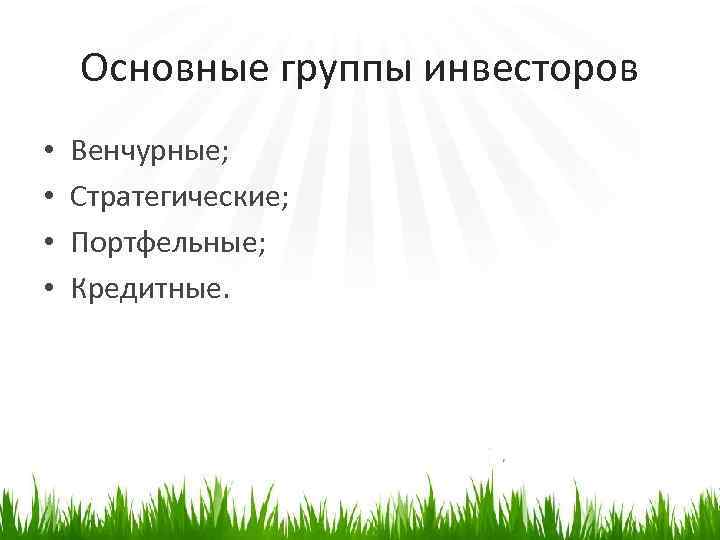 Основные группы инвесторов • • Венчурные; Стратегические; Портфельные; Кредитные.