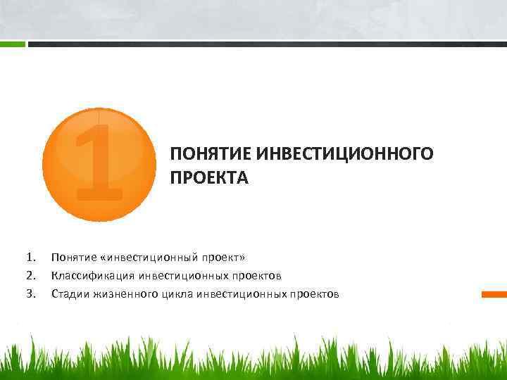1 1. 2. 3. ПОНЯТИЕ ИНВЕСТИЦИОННОГО ПРОЕКТА Понятие «инвестиционный проект» Классификация инвестиционных проектов Стадии жизненного цикла инвестиционных проектов