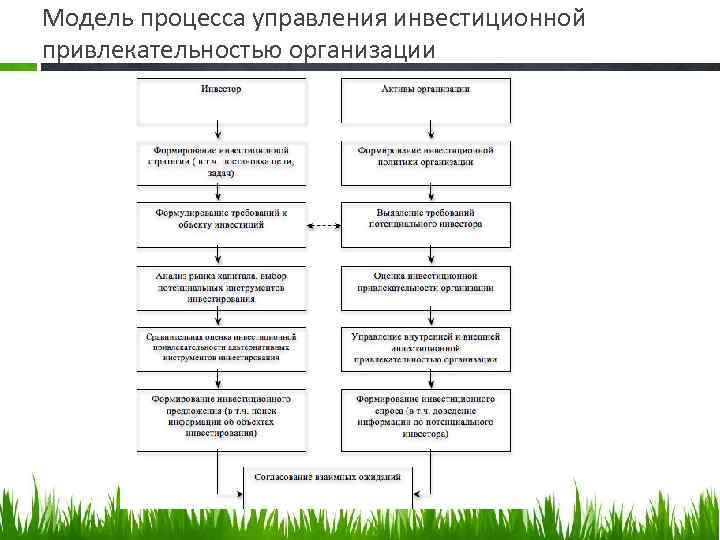 Управление инвестиционной привлекательностью – процесс оценки, создания условий, позиционирования, стимулирования и мониторинга привлекательности организации для инвестора. включает: • разработку инвестиционной политики компании, определение целей инвестирования; • разработку инвестиционного проекта; • анализ собственных источников инвестиций и определение потребности во внешних инвестициях; • анализ рынка капиталов и инвестиционного пространства; • исследование требований внешних инвесторов к инвестиционно привлекательным компаниям, изучение процесса принятия инвестора о вложении средств, определение «портрета» потенциального инвестора; • анализ возможностей удовлетворить требования внешних инвесторов, отбор возможных категорий внешних инвесторов; • разработку программ, мероприятий по приближению показателей деятельности компании к требованиями инвесторов; • разработку механизмов инвестирования, определение гарантий инвесторам; • оценку эффективности управления инвестиционной привлекательностью.