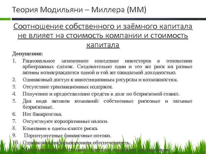 Теория Модильяни – Миллера (ММ) Соотношение собственного и заёмного капитала не влияет на стоимость компании и стоимость капитала Допущения: 1. Рациональное мгновенное поведение инвесторов в отношении арбитражных сделок. Следовательно один и тот же риск на разные активы вознаграждается одной и той же ожидаемой доходностью. 2. Одинаковый доступ к инвестиционным ресурсам и возможностям. 3. Отсутствие транзакционных издержек. 4. Получение и предоставление средств в долг по безрисковой ставке. 5. Два вида активов компаний: собственные рисковые и заемные безрисковые. 6. Нет банкротства. 7. Отсутствуют корпоративные налоги. 8. Компании в одном классе риска. 9. Перпетуитетные финансовые потоки. 10. Одинаковая информационная обеспеченность. 11. Максимизация собственного капитала компании менеджерами.