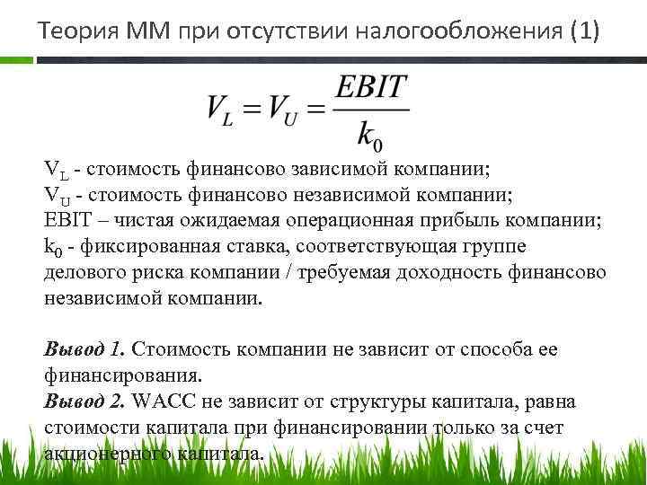 Теория ММ при отсутствии налогообложения (1) VL стоимость финансово зависимой компании; VU стоимость финансово независимой компании; EBIT – чистая ожидаемая операционная прибыль компании; k 0 фиксированная ставка, соответствующая группе делового риска компании / требуемая доходность финансово независимой компании. Вывод 1. Стоимость компании не зависит от способа ее финансирования. Вывод 2. WACC не зависит от структуры капитала, равна стоимости капитала при финансировании только за счет акционерного капитала.