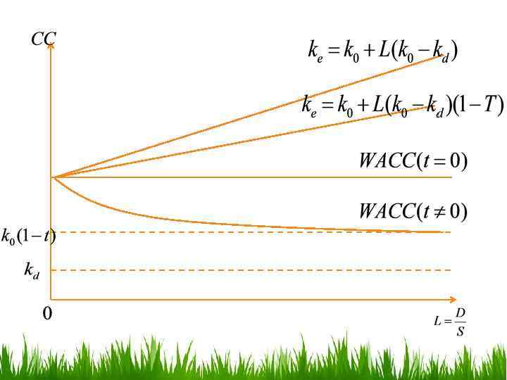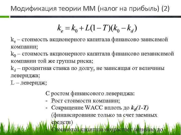Модификация теории ММ (налог на прибыль) (2) ke – стоимость акционерного капитала финансово зависимой компании; k 0 – стоимость акционерного капитала финансово независимой компании той же группы риска; kd – процентная ставка по долгу, не зависящая от величины левериджа; L – леверидж; С ростом финансового левериджа: Рост стоимости компании; Сокращение WACC вплоть до k 0(1 -T) (финансирование только за счет заемных средств) Стоимотсь капитала возрастает линейно до