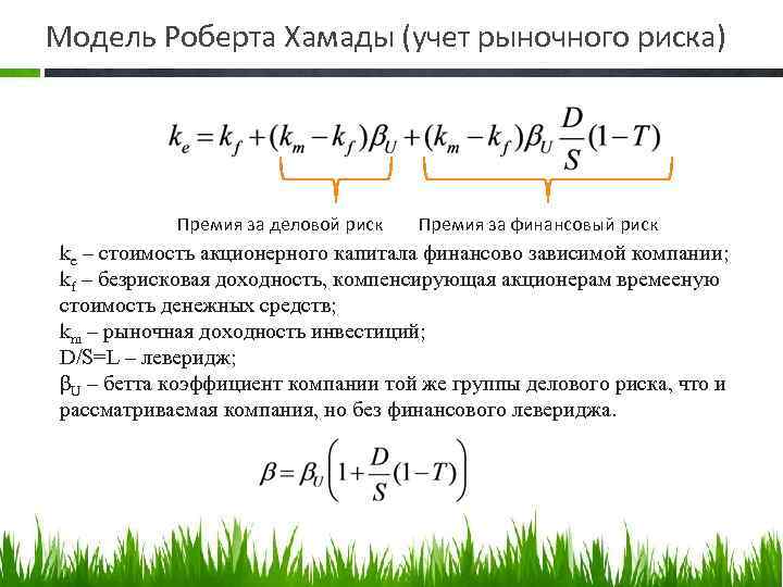 Модель Роберта Хамады (учет рыночного риска) Премия за деловой риск Премия за финансовый риск ke – стоимость акционерного капитала финансово зависимой компании; kf – безрисковая доходность, компенсирующая акционерам времееную стоимость денежных средств; km – рыночная доходность инвестиций; D/S=L – леверидж; βU – бетта коэффициент компании той же группы делового риска, что и рассматриваемая компания, но без финансового левериджа.