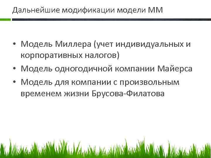 Дальнейшие модификации модели ММ • Модель Миллера (учет индивидуальных и корпоративных налогов) • Модель одногодичной компании Майерса • Модель для компании с произвольным временем жизни Брусова Филатова
