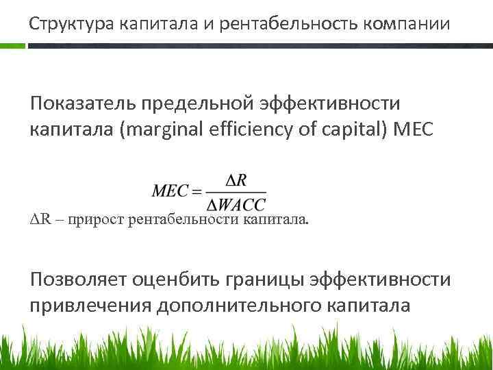 Структура капитала и рентабельность компании Показатель предельной эффективности капитала (marginal efficiency of capital) MEC ΔR – прирост рентабельности капитала. Позволяет оценбить границы эффективности привлечения дополнительного капитала