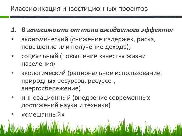Классификация инвестиционных проектов 1. В зависимости от типа ожидаемого эффекта: • экономический (снижение издержек, риска, повышение или получение дохода); • социальный (повышение качества жизни населения) • экологический (рациональное использование природных ресурсов, ресурсо , энергосбережение) • инновационный (внедрение современных достижений науки и техники) • «смешанный»