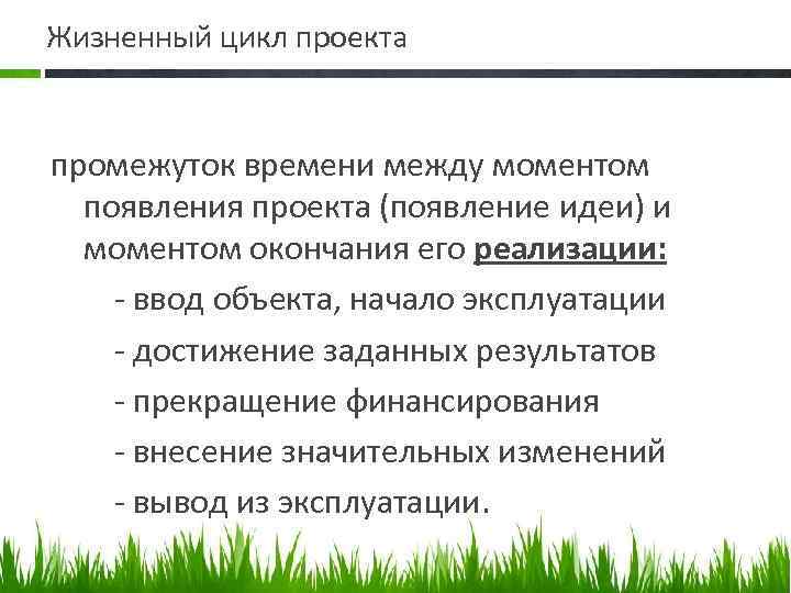 Жизненный цикл проекта промежуток времени между моментом появления проекта (появление идеи) и моментом окончания его реализации: ввод объекта, начало эксплуатации достижение заданных результатов прекращение финансирования внесение значительных изменений вывод из эксплуатации.