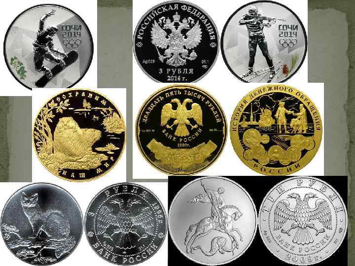 золотые (50 и 100 рублей) и серебряные (3 рубля) монеты «Зимние Олимпийские игры 2014» ; золотая монета «Речной бобр» — 100 рублей 2008 года выпуска; золотая монета «История денежного обращения России» — 100 рублей 2009 года выпуска; серебряная монета «Соболь» — 3 рубля 1995 года выпуска; серебряная монета «Георгий Победоносец» — 3 рубля 2009— 2010 годов выпуска.