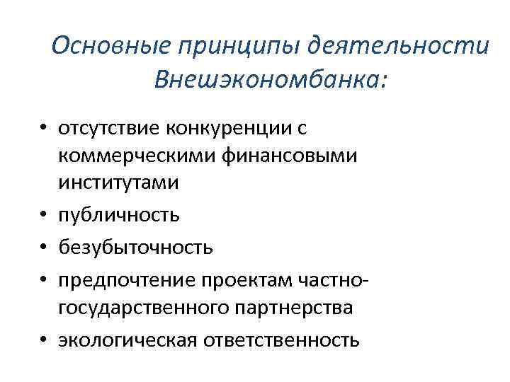 Основные принципы деятельности Внешэкономбанка: • отсутствие конкуренции с коммерческими финансовыми институтами • публичность • безубыточность • предпочтение проектам частногосударственного партнерства • экологическая ответственность
