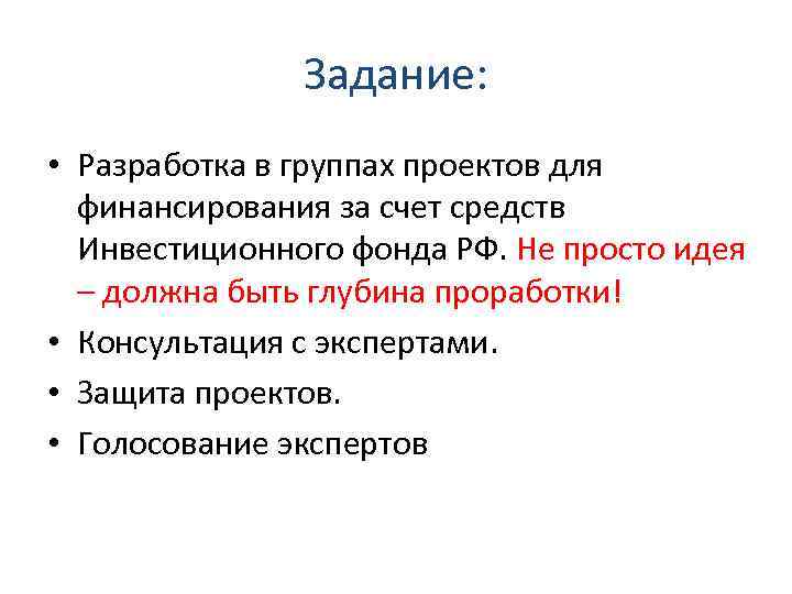 Задание: • Разработка в группах проектов для финансирования за счет средств Инвестиционного фонда РФ. Не просто идея – должна быть глубина проработки! • Консультация с экспертами. • Защита проектов. • Голосование экспертов