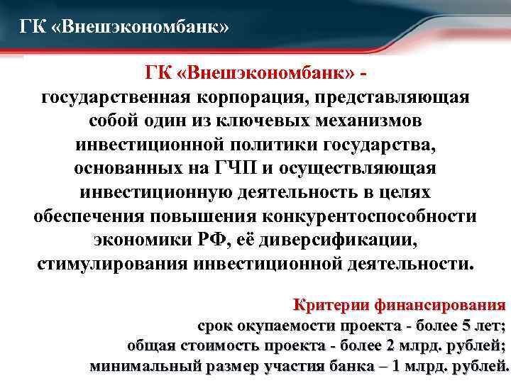 ГК «Внешэкономбанк» государственная корпорация, представляющая собой один из ключевых механизмов инвестиционной политики государства, основанных на ГЧП и осуществляющая инвестиционную деятельность в целях обеспечения повышения конкурентоспособности экономики РФ, её диверсификации, стимулирования инвестиционной деятельности. Критерии финансирования срок окупаемости проекта - более 5 лет; общая стоимость проекта - более 2 млрд. рублей; минимальный размер участия банка – 1 млрд. рублей.