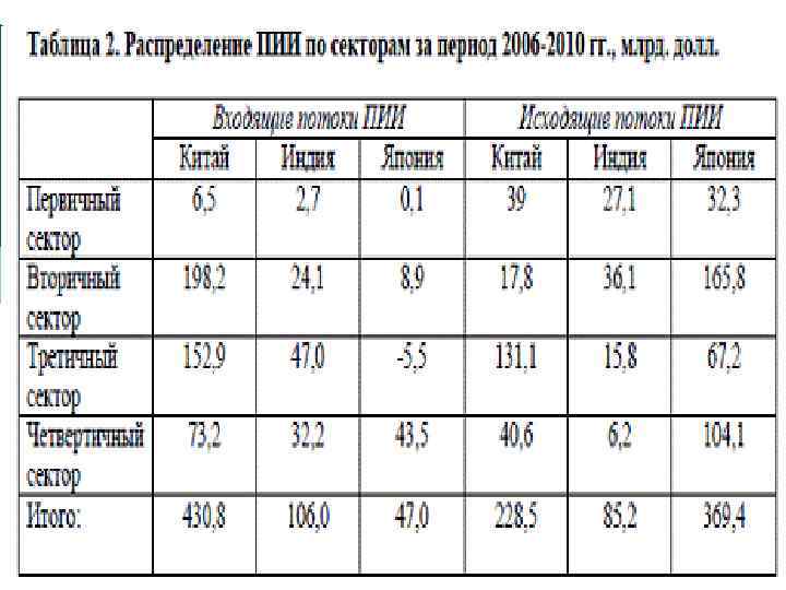 Внутренние инвестиции Японии и стран соседей, млрд. долл. , 19702013 Год Китай Япония Россия Южная Корея 1970 30. 3 81. 2 2. 6 1980 106. 8 348. 9 24 1990 141. 1 1008. 3 172 116. 9 2000 420. 9 1187. 8 48. 6 185 2010 2859. 6 1089. 4 344. 9 350. 5 2013 4387. 5 1030. 5 473. 6 378. 2