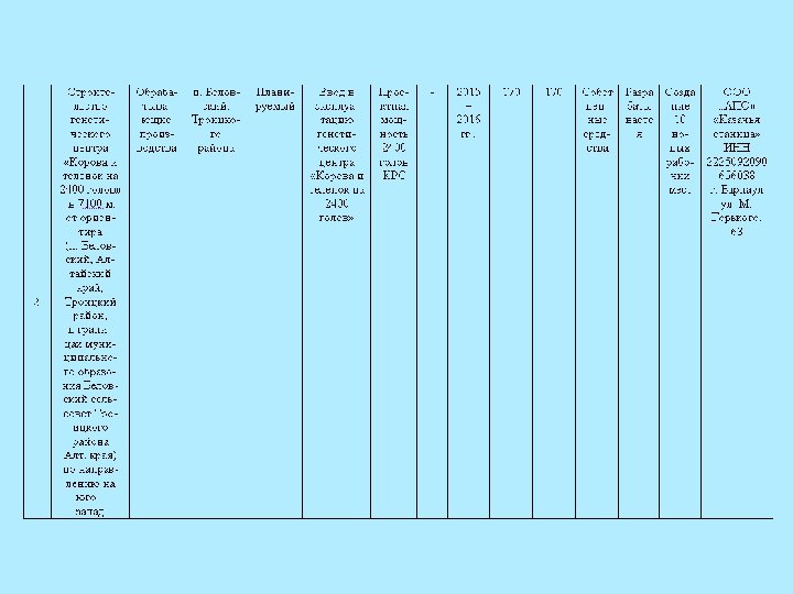 16 17 18 Близлежащие производственные объекты (промышленные, сельскохозяйственные, иные) наименование ИП Бердышев, ООО «Уткуль» расстояние км 0, 1 Расстояние до ближайших жилых домов м 750 Дополнительная информация по объекту не эксплуатируется ____ лет, процедура банкротства, продаваемая доля бизнеса ___%, иное Не эксплуатируется, % износа - 91. ФИО контактного лица телефон (номер должен начинаться с +7, 385, код муниципального образования, а затем непосредственный контактный номер) Долгова Татьяна Петровна e-mail dlg@troalt. ru Контакты ________ +7(375 -34) 2 -21 -70