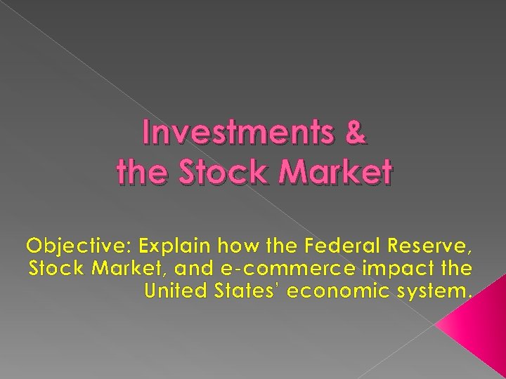 Investments & the Stock Market Objective: Explain how the Federal Reserve, Stock Market, and e-commerce impact the United States’ economic system.