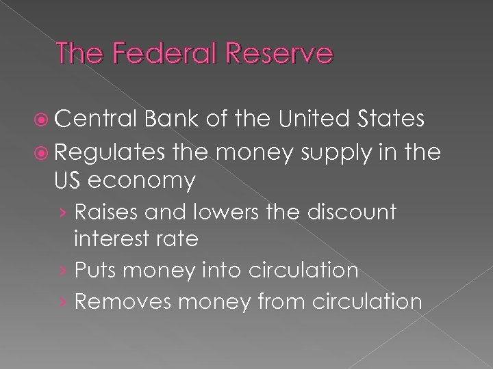 The Federal Reserve Central Bank of the United States Regulates the money supply in the US economy › Raises and lowers the discount interest rate › Puts money into circulation › Removes money from circulation