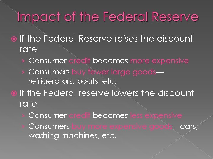 Impact of the Federal Reserve If the Federal Reserve raises the discount rate › Consumer credit becomes more expensive › Consumers buy fewer large goods— refrigerators, boats, etc. If the Federal reserve lowers the discount rate › Consumer credit becomes less expensive › Consumers buy more expensive goods—cars, washing machines, etc.