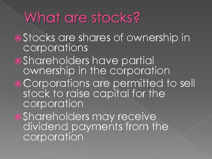 What are stocks? Stocks are shares of ownership in corporations Shareholders have partial ownership in the corporation Corporations are permitted to sell stock to raise capital for the corporation Shareholders may receive dividend payments from the corporation