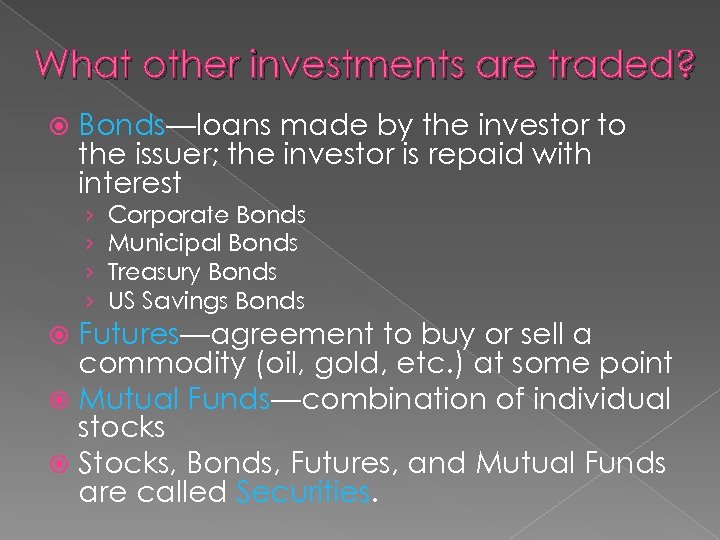 What other investments are traded? Bonds—loans made by the investor to the issuer; the investor is repaid with interest › › Corporate Bonds Municipal Bonds Treasury Bonds US Savings Bonds Futures—agreement to buy or sell a commodity (oil, gold, etc. ) at some point Mutual Funds—combination of individual stocks Stocks, Bonds, Futures, and Mutual Funds are called Securities.