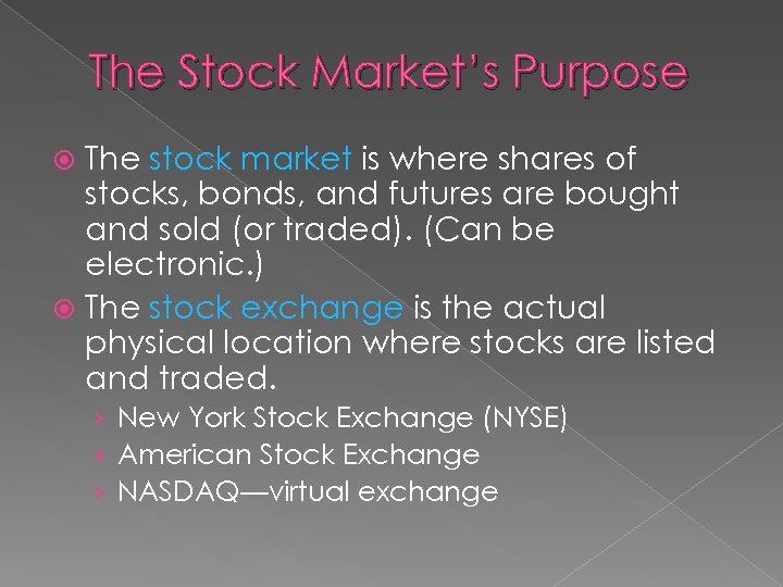 The Stock Market’s Purpose The stock market is where shares of stocks, bonds, and futures are bought and sold (or traded). (Can be electronic. ) The stock exchange is the actual physical location where stocks are listed and traded. › New York Stock Exchange (NYSE) › American Stock Exchange › NASDAQ—virtual exchange