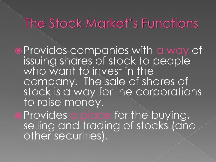 The Stock Market’s Functions Provides companies with a way of issuing shares of stock to people who want to invest in the company. The sale of shares of stock is a way for the corporations to raise money. Provides a place for the buying, selling and trading of stocks (and other securities).