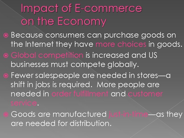 Impact of E-commerce on the Economy Because consumers can purchase goods on the Internet they have more choices in goods. Global competition is increased and US businesses must compete globally. Fewer salespeople are needed in stores—a shift in jobs is required. More people are needed in order fulfillment and customer service. Goods are manufactured just-in-time—as they are needed for distribution.