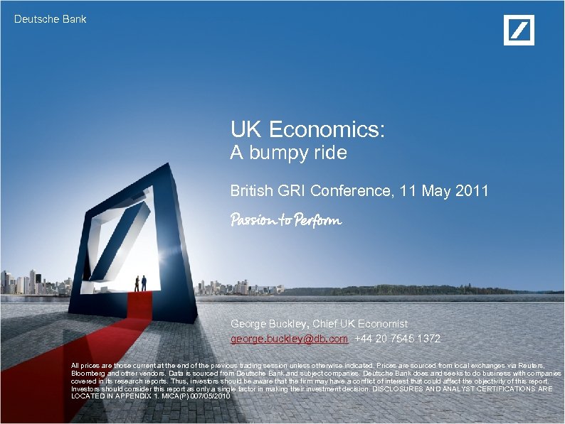 Deutsche Bank UK Economics: A bumpy ride British GRI Conference, 11 May 2011 George Buckley, Chief UK Economist george. buckley@db. com +44 20 7545 1372 All prices are those current at the end of the previous trading session unless otherwise indicated. Prices are sourced from local exchanges via Reuters, Bloomberg and other vendors. Data is sourced from Deutsche Bank and subject companies. Deutsche Bank does and seeks to do business with companies covered in its research reports. Thus, investors should be aware that the firm may have a conflict of interest that could affect the objectivity of this report. Investors should consider this report as only a single factor in making their investment decision. DISCLOSURES AND ANALYST CERTIFICATIONS ARE LOCATED IN APPENDIX 1. MICA(P) 007/05/2010
