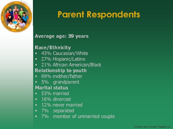 Parent Respondents Average age: 39 years Race/Ethnicity § 43% Caucasian/White § 27% Hispanic/Latino § 21% African American/Black Relationship to youth § 89% mother/father § 5% grandparent Marital status § 53% married § 16% divorced § 12% never married § 7% separated § 7% member of unmarried couple Families and Schools Together Inc.
