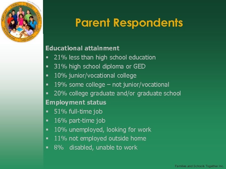 Parent Respondents Educational attainment § 21% less than high school education § 31% high school diploma or GED § 10% junior/vocational college § 19% some college – not junior/vocational § 20% college graduate and/or graduate school Employment status § 51% full-time job § 16% part-time job § 10% unemployed, looking for work § 11% not employed outside home § 8% disabled, unable to work Families and Schools Together Inc.