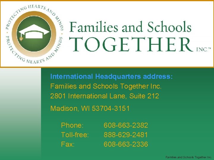 International Headquarters address: Families and Schools Together Inc. 2801 International Lane, Suite 212 Madison, WI 53704 -3151 Phone: Toll-free: Fax: 608 -663 -2382 888 -629 -2481 608 -663 -2336 Families and Schools Together Inc.