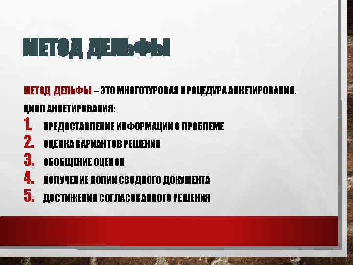 МЕТОД ДЕЛЬФЫ – ЭТО МНОГОТУРОВАЯ ПРОЦЕДУРА АНКЕТИРОВАНИЯ. ЦИКЛ АНКЕТИРОВАНИЯ: 1. 2. 3. 4. 5. ПРЕДОСТАВЛЕНИЕ ИНФОРМАЦИИ О ПРОБЛЕМЕ ОЦЕНКА ВАРИАНТОВ РЕШЕНИЯ ОБОБЩЕНИЕ ОЦЕНОК ПОЛУЧЕНИЕ КОПИИ СВОДНОГО ДОКУМЕНТА ДОСТИЖЕНИЯ СОГЛАСОВАННОГО РЕШЕНИЯ