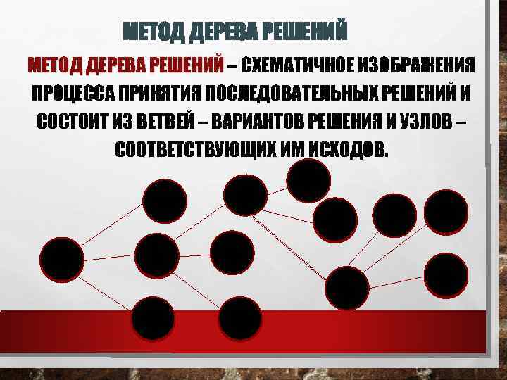 МЕТОД ДЕРЕВА РЕШЕНИЙ – СХЕМАТИЧНОЕ ИЗОБРАЖЕНИЯ ПРОЦЕССА ПРИНЯТИЯ ПОСЛЕДОВАТЕЛЬНЫХ РЕШЕНИЙ И СОСТОИТ ИЗ ВЕТВЕЙ – ВАРИАНТОВ РЕШЕНИЯ И УЗЛОВ – СООТВЕТСТВУЮЩИХ ИМ ИСХОДОВ.