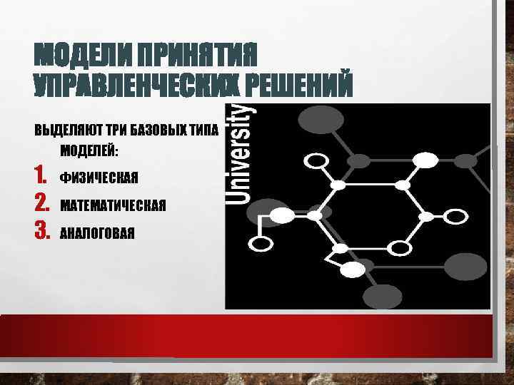МОДЕЛИ ПРИНЯТИЯ УПРАВЛЕНЧЕСКИХ РЕШЕНИЙ ВЫДЕЛЯЮТ ТРИ БАЗОВЫХ ТИПА МОДЕЛЕЙ: 1. 2. 3. ФИЗИЧЕСКАЯ МАТЕМАТИЧЕСКАЯ АНАЛОГОВАЯ