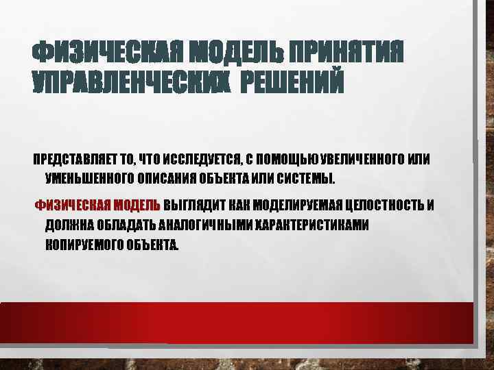 ФИЗИЧЕСКАЯ МОДЕЛЬ ПРИНЯТИЯ УПРАВЛЕНЧЕСКИХ РЕШЕНИЙ ПРЕДСТАВЛЯЕТ ТО, ЧТО ИССЛЕДУЕТСЯ, С ПОМОЩЬЮ УВЕЛИЧЕННОГО ИЛИ УМЕНЬШЕННОГО ОПИСАНИЯ ОБЪЕКТА ИЛИ СИСТЕМЫ. ФИЗИЧЕСКАЯ МОДЕЛЬ ВЫГЛЯДИТ КАК МОДЕЛИРУЕМАЯ ЦЕЛОСТНОСТЬ И ДОЛЖНА ОБЛАДАТЬ АНАЛОГИЧНЫМИ ХАРАКТЕРИСТИКАМИ КОПИРУЕМОГО ОБЪЕКТА.