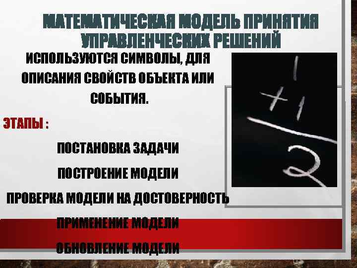 МАТЕМАТИЧЕСКАЯ МОДЕЛЬ ПРИНЯТИЯ УПРАВЛЕНЧЕСКИХ РЕШЕНИЙ ИСПОЛЬЗУЮТСЯ СИМВОЛЫ, ДЛЯ ОПИСАНИЯ СВОЙСТВ ОБЪЕКТА ИЛИ СОБЫТИЯ. ЭТАПЫ : ПОСТАНОВКА ЗАДАЧИ ПОСТРОЕНИЕ МОДЕЛИ ПРОВЕРКА МОДЕЛИ НА ДОСТОВЕРНОСТЬ ПРИМЕНЕНИЕ МОДЕЛИ ОБНОВЛЕНИЕ МОДЕЛИ