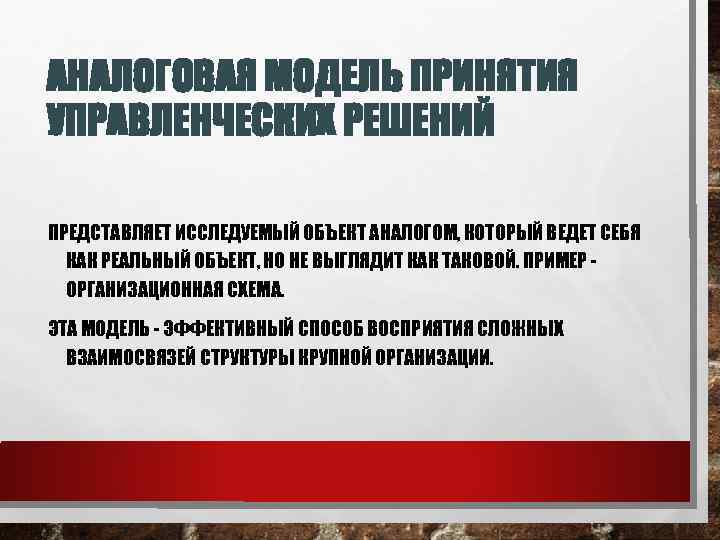 АНАЛОГОВАЯ МОДЕЛЬ ПРИНЯТИЯ УПРАВЛЕНЧЕСКИХ РЕШЕНИЙ ПРЕДСТАВЛЯЕТ ИССЛЕДУЕМЫЙ ОБЪЕКТ АНАЛОГОМ, КОТОРЫЙ ВЕДЕТ СЕБЯ КАК РЕАЛЬНЫЙ ОБЪЕКТ, НО НЕ ВЫГЛЯДИТ КАК ТАКОВОЙ. ПРИМЕР ОРГАНИЗАЦИОННАЯ СХЕМА. ЭТА МОДЕЛЬ - ЭФФЕКТИВНЫЙ СПОСОБ ВОСПРИЯТИЯ СЛОЖНЫХ ВЗАИМОСВЯЗЕЙ СТРУКТУРЫ КРУПНОЙ ОРГАНИЗАЦИИ.