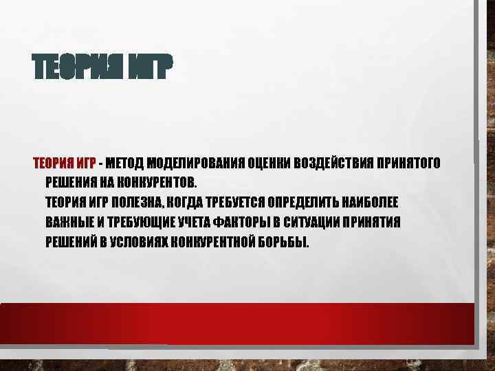 ТЕОРИЯ ИГР - МЕТОД МОДЕЛИРОВАНИЯ ОЦЕНКИ ВОЗДЕЙСТВИЯ ПРИНЯТОГО РЕШЕНИЯ НА КОНКУРЕНТОВ. ТЕОРИЯ ИГР ПОЛЕЗНА, КОГДА ТРЕБУЕТСЯ ОПРЕДЕЛИТЬ НАИБОЛЕЕ ВАЖНЫЕ И ТРЕБУЮЩИЕ УЧЕТА ФАКТОРЫ В СИТУАЦИИ ПРИНЯТИЯ РЕШЕНИЙ В УСЛОВИЯХ КОНКУРЕНТНОЙ БОРЬБЫ.
