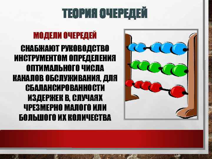 ТЕОРИЯ ОЧЕРЕДЕЙ МОДЕЛИ ОЧЕРЕДЕЙ СНАБЖАЮТ РУКОВОДСТВО ИНСТРУМЕНТОМ ОПРЕДЕЛЕНИЯ ОПТИМАЛЬНОГО ЧИСЛА КАНАЛОВ ОБСЛУЖИВАНИЯ, ДЛЯ СБАЛАНСИРОВАННОСТИ ИЗДЕРЖЕК В, СЛУЧАЯХ ЧРЕЗМЕРНО МАЛОГО ИЛИ БОЛЬШОГО ИХ КОЛИЧЕСТВА.