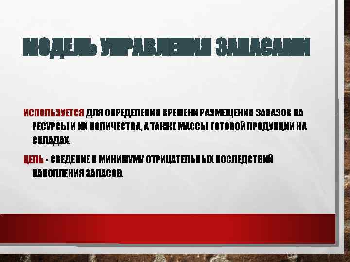 МОДЕЛЬ УПРАВЛЕНИЯ ЗАПАСАМИ ИСПОЛЬЗУЕТСЯ ДЛЯ ОПРЕДЕЛЕНИЯ ВРЕМЕНИ РАЗМЕЩЕНИЯ ЗАКАЗОВ НА РЕСУРСЫ И ИХ КОЛИЧЕСТВА, А ТАКЖЕ МАССЫ ГОТОВОЙ ПРОДУКЦИИ НА СКЛАДАХ. ЦЕЛЬ - СВЕДЕНИЕ К МИНИМУМУ ОТРИЦАТЕЛЬНЫХ ПОСЛЕДСТВИЙ НАКОПЛЕНИЯ ЗАПАСОВ.