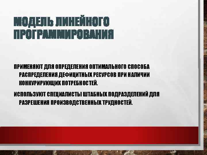 МОДЕЛЬ ЛИНЕЙНОГО ПРОГРАММИРОВАНИЯ ПРИМЕНЯЮТ ДЛЯ ОПРЕДЕЛЕНИЯ ОПТИМАЛЬНОГО СПОСОБА РАСПРЕДЕЛЕНИЯ ДЕФИЦИТНЫХ РЕСУРСОВ ПРИ НАЛИЧИИ КОНКУРИРУЮЩИХ ПОТРЕБНОСТЕЙ. ИСПОЛЬЗУЮТ СПЕЦИАЛИСТЫ ШТАБНЫХ ПОДРАЗДЕЛЕНИЙ ДЛЯ РАЗРЕШЕНИЯ ПРОИЗВОДСТВЕННЫХ ТРУДНОСТЕЙ.