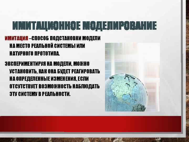 ИМИТАЦИОННОЕ МОДЕЛИРОВАНИЕ ИМИТАЦИЯ –СПОСОБ ПОДСТАНОВКИ МОДЕЛИ НА МЕСТО РЕАЛЬНОЙ СИСТЕМЫ ИЛИ НАТУРНОГО ПРОТОТИПА. ЭКСПЕРИМЕНТИРУЯ НА МОДЕЛИ, МОЖНО УСТАНОВИТЬ, КАК ОНА БУДЕТ РЕАГИРОВАТЬ НА ОПРЕДЕЛЕННЫЕ ИЗМЕНЕНИЯ, ЕСЛИ ОТСУТСТВУЕТ ВОЗМОЖНОСТЬ НАБЛЮДАТЬ ЭТУ СИСТЕМУ В РЕАЛЬНОСТИ.