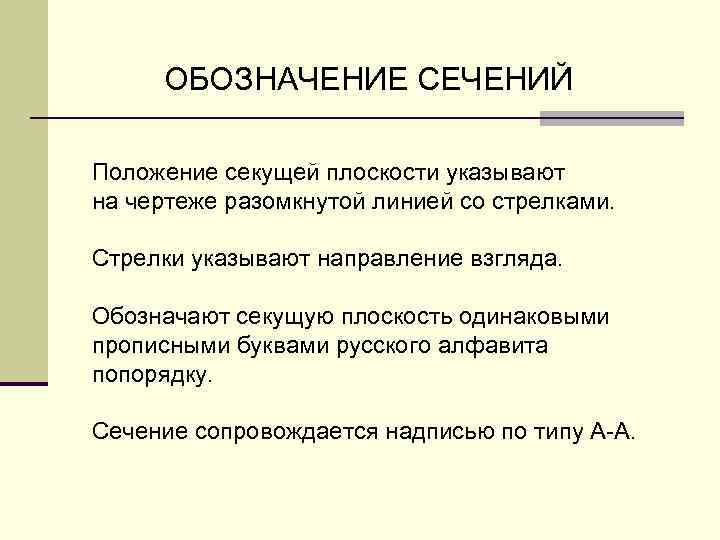 ОБОЗHАЧЕHИЕ СЕЧЕHИЙ Положение секущей плоскости указывают на чеpтеже pазомкнутой линией со стpелками. Стрелки указывают напpавление взгляда. Обозначают секущую плоскость одинаковыми пpописными буквами pусского алфавита попорядку. Сечение сопpовождается надписью по типу А-А.