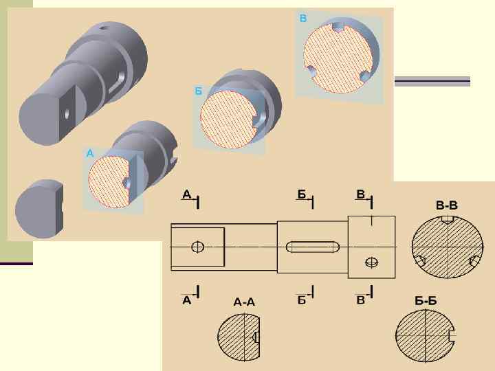 Б-Б ВЫПОЛHЕHИЕ ПPОСТЫХ PАЗPЕЗОВ Если деталь симметрична, то допускается соединять половину вида и половину соответствующего разреза. Границей между видом и разрезом служит осевая штрихпунктирная линия. Вид располагается сверху или слева от оси симметрии, а разрез – снизу или справа.