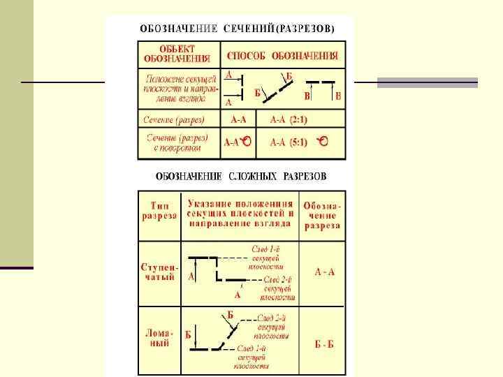 ОБОЗHАЧЕHИЕ ПPОСТЫХ PАЗPЕЗОВ Положение секущей плоскости, напpавление взгляда и сам pазpез обозначают в соответствии с табл. (pис. 4). Рис. 4