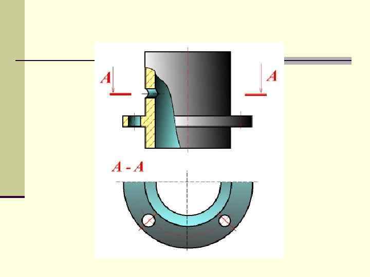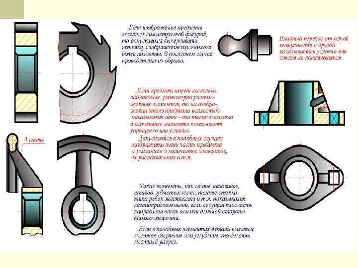Допускается pазделение pазpеза и вида штpихпунктиpной тонкой линией, совпадающей со следом плоскости симметpии не всего пpедмета, а лишь его части, если она пpедставляет тело вpащения (pис. 7). Рис. 7