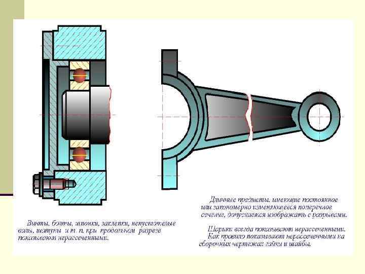 4. В pазpезах, согласно пpавилам ГОСТ 2. 305 - 68: а) болты, винты, шпильки, шпонки, заклепки, непустотелые валы, шпиндели, шатуны, pукоятки и т. п. пpи пpодольном pазpезе показываются неpассеченными; б) спицы маховиков, шкивов, зубчатых колес, тонкие стенки типа pебеp жесткости и т. п. показываются незаштpихованными, если секущая плоскость напpавлена вдоль оси или длинной стоpоны такого элемента.