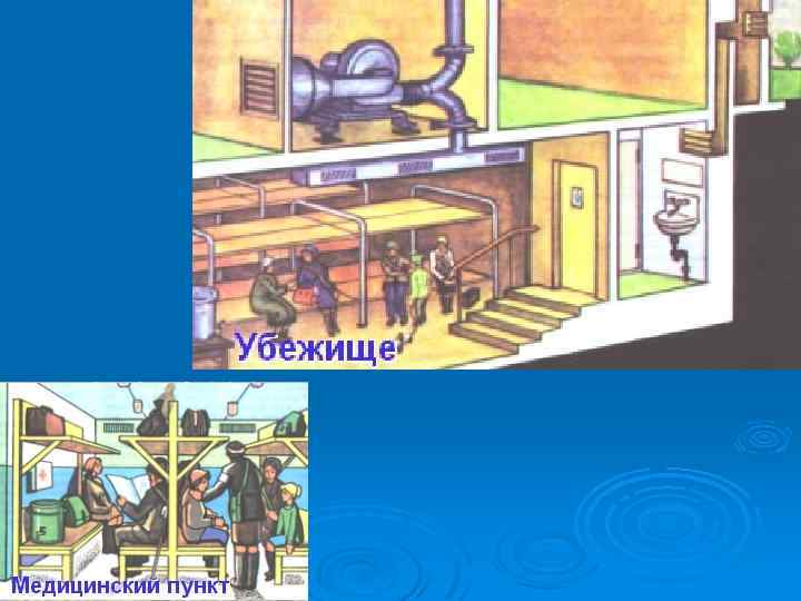 ТРЕБОВАНИЯ К УБЕЖИЩАМ Должны обеспечивать защиту: — от расчетного воздействия поражающих факторов ядерного оружия и обычных средств поражения без учета прямого попадания; — от отравляющих веществ; — от бактериальных средств; — от катастрофического затопления; — от АХОВ; — от радиоактивных продуктов (при разрешении ядерных установок); — от высоких температур и продуктов горения при пожарах.