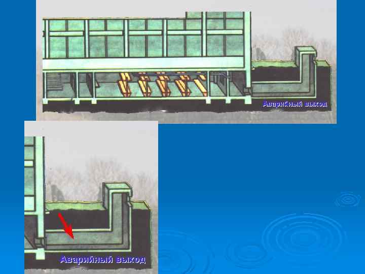 5 4 О О 3 О О 4 6 7 8 9 10 1 5 11 2 12 О О 13 14 1 - помещение для укрываемых; 2 и 3 - санитарные узлы; 4 - тамбуры; 5 - входные шлюзы; 6 - помещение для хранения продовольствия; 7 - медицинский пункт; 8 - пункт управления; 9 - фильтровентиляционная камера; 10 - вход; 11 - дизельная электростанция; 12 - склад ГСМ; 13 - щитовая; 14 - аварийный выход.